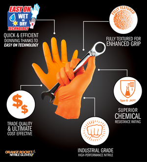 The only tough industrial hi-vis nitrile glove with EASY ON technology!