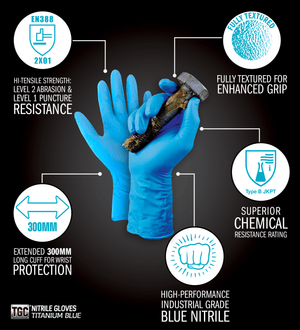 Certified scientific results that establish TGC Titanium Gloves safety performance as one of the highest available in a disposable glove. TGC Titanium Blue Nitrile Disposable Gloves have been independently Australian third party tested & certified to protect the wearer from mechanical hazards. The only disposable glove that has achieved under EN388 a level 2 abrasion resistance certification AND a level 1 puncture resistance certification.